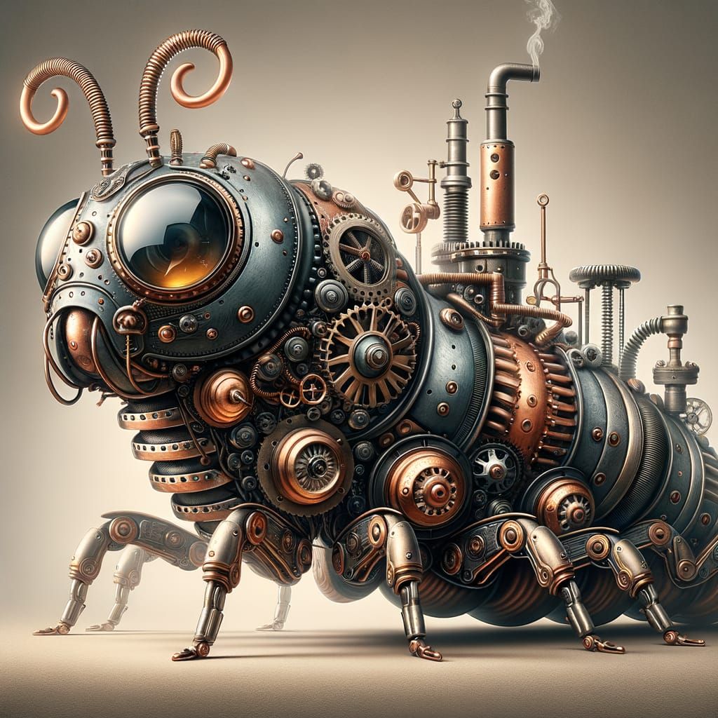 This image shows a steampunk-style mechanical caterpillar. The detailed insect features a segmented metallic body with visible gears, pistons, and smoking pipes, rendered in hyper-realistic detail with vintage industrial design elements.