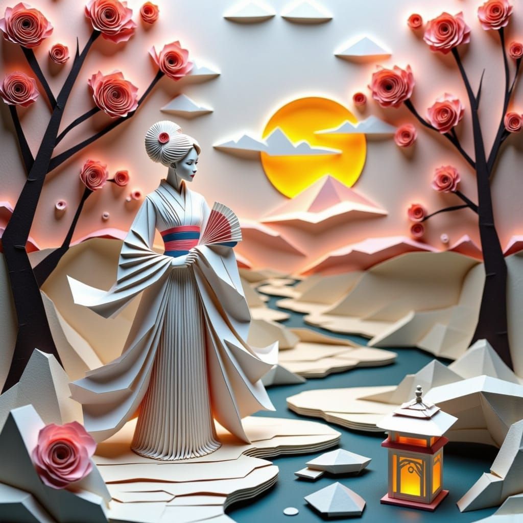 This image features a geisha figure meticulously crafted from folded paper, set within a tranquil Japanese garden made of origami elements. The scene showcases intricate paper sculptures of flora and fauna.