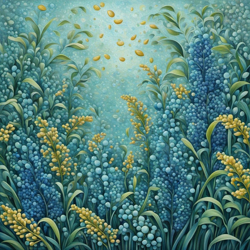 This abstract surrealism painting features a barberry sapphire hurricane in Nile blue and sea green with kinetic pointillism and cel-shaded elements.