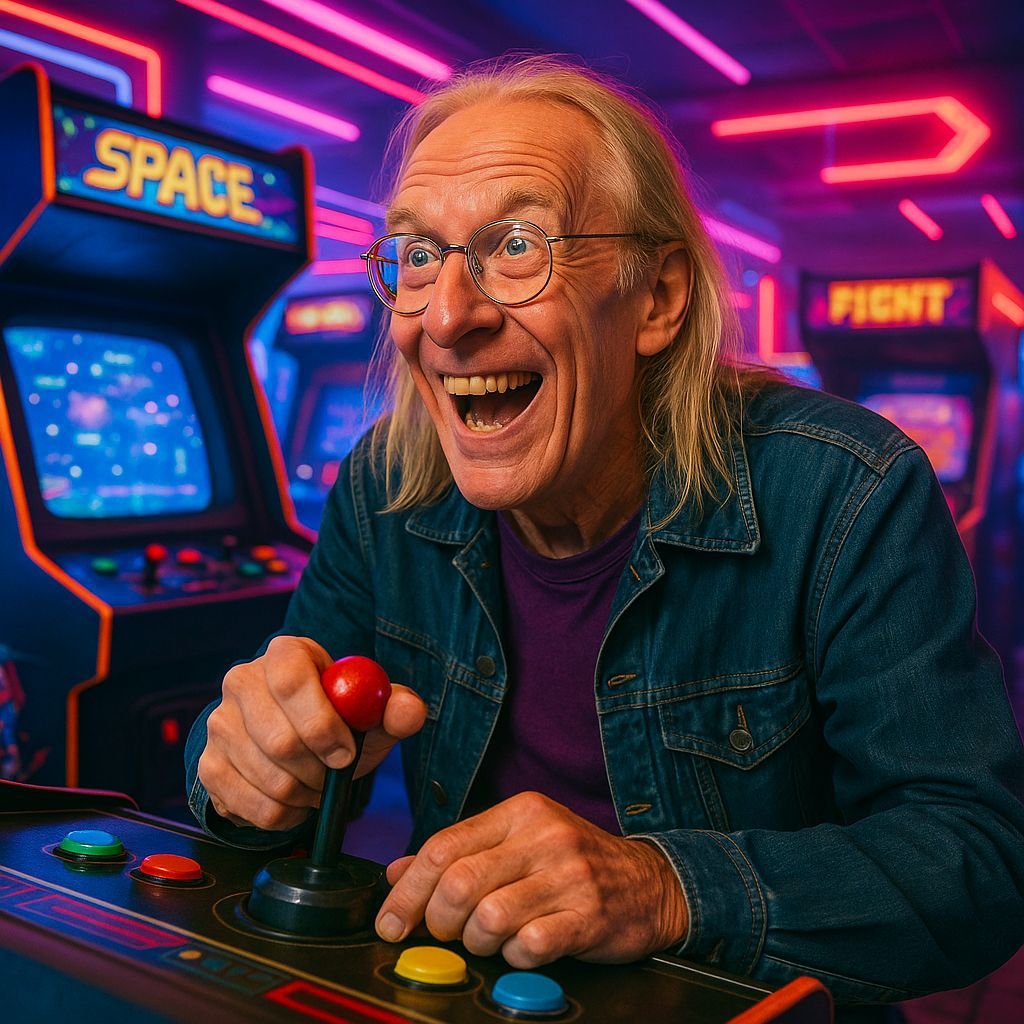 This image shows an elderly man with long blonde hair playing video games in a futuristic arcade. Neon lights and retro machines surround him as he holds a joystick with excitement. The image captures a cyberpunk aesthetic.