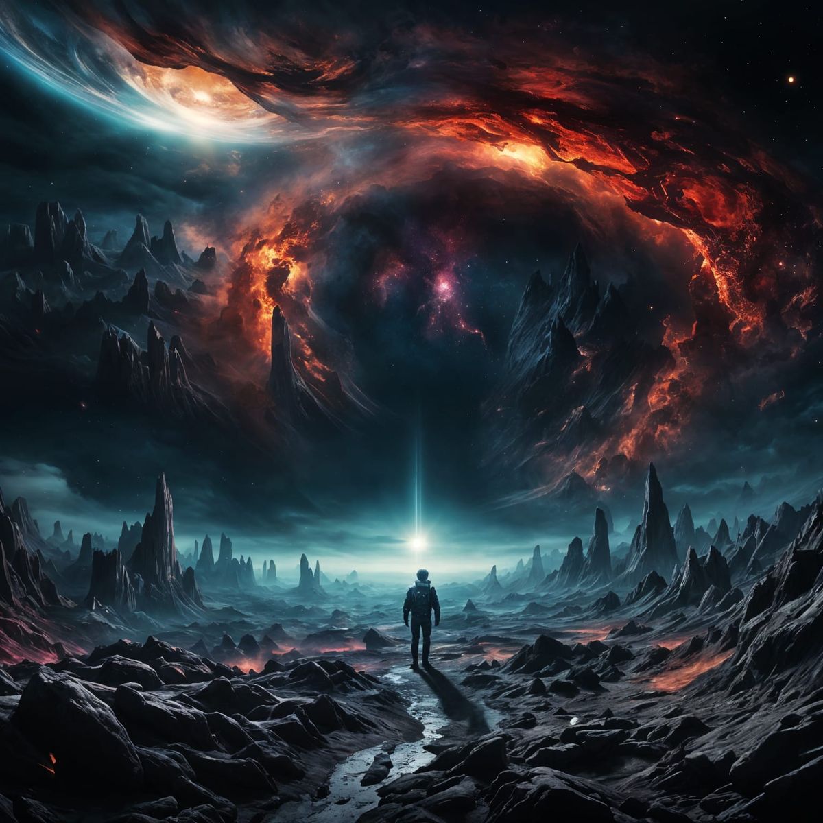This image shows a figure silhouetted at the edge of the world gazing into a cosmic abyss. The scene is rendered with photorealistic detail, a dystopian atmosphere, and vibrant colors in a dark fantasy style.