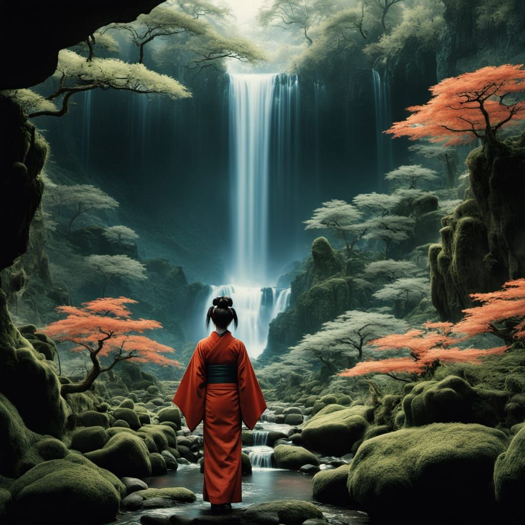 This image shows a geisha in a dragon-motif kimono in a bioluminescent grotto. Glowing flora and waterfalls of light surround her in this cinematic scene.