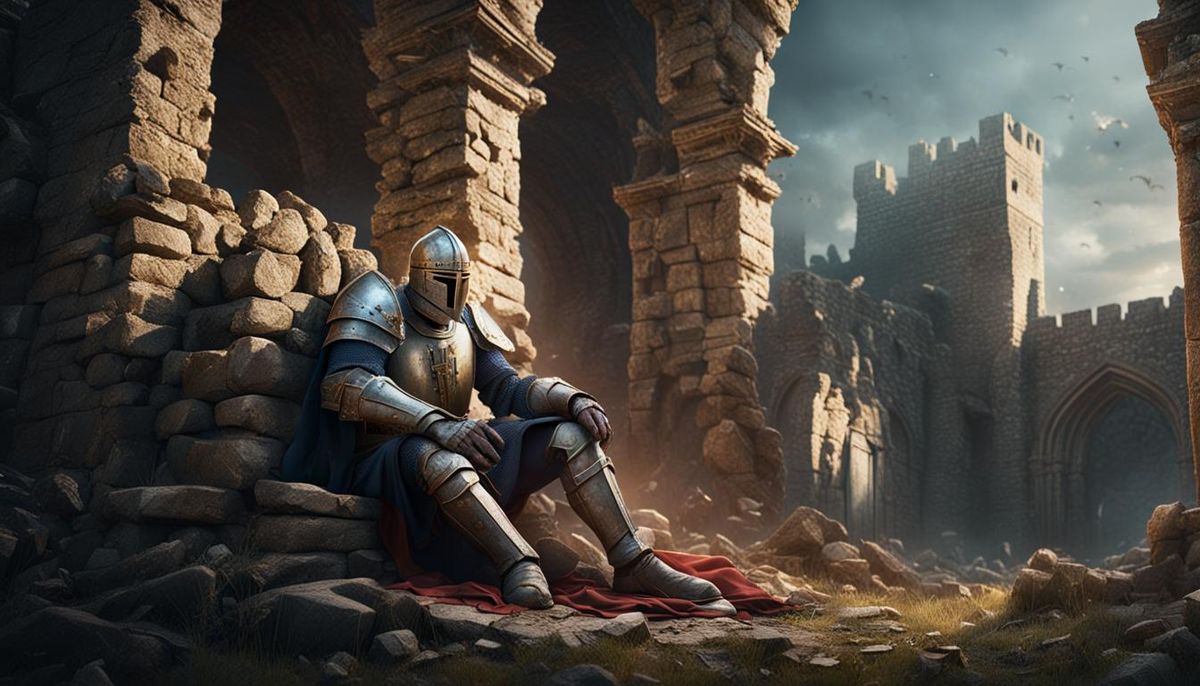 A striking picture of a battle-weary knight taking respite amidst castle ruins. The image is a detailed matte painting with deep colors and intricate details, rendered as fantasy concept art.