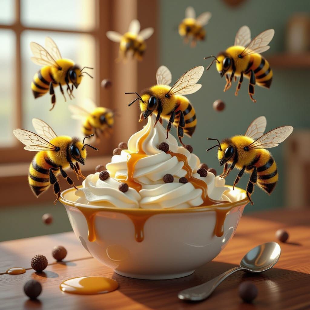 Intricately detailed 8k resolution concept art: deranged, drunken bees hover excitedly over a bowl of white milk ice cream, drizzled with caramel syrup and sprinkled with small chocolate balls. The image embodies the captivating essence of Disney and Pixar, with masterful volumetric lighting, reminiscent ...