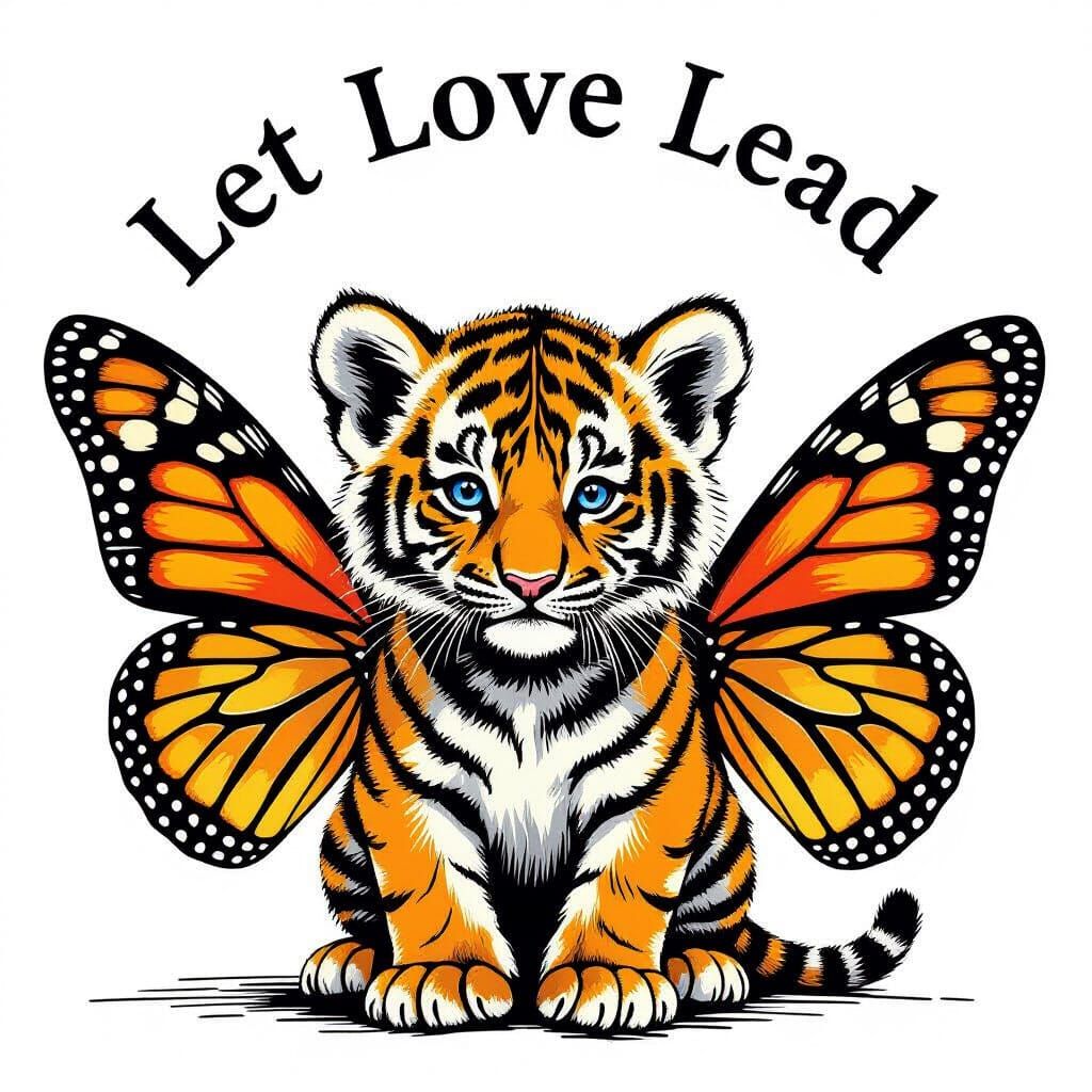A striking graphic illustration of a tiger cub with delicate butterfly wings, rendered in a dry black brush technique. Features an arched inscription and a whimsical, high-contrast aesthetic.