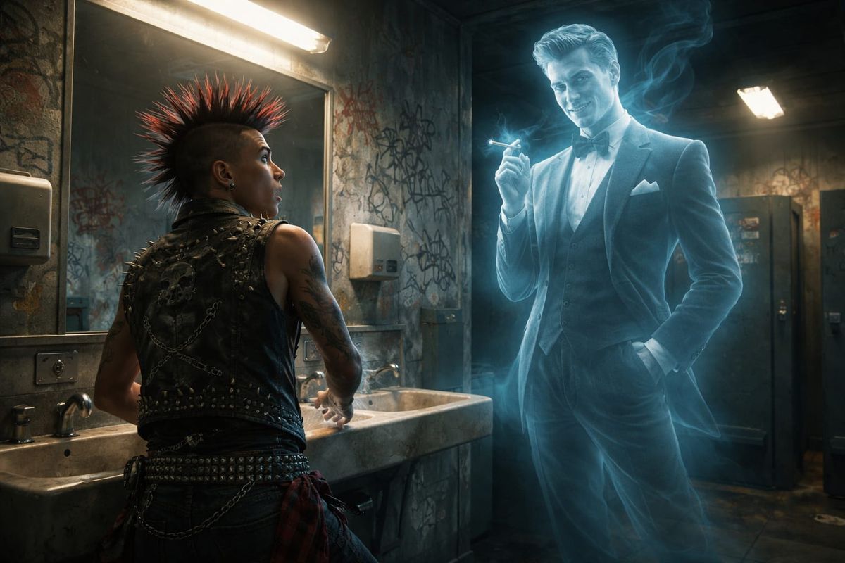 A punk teen in a modern day restroom is washing his hands, turns around an is shocked to see a misty translucent 1930s era phantom apparition, dressed in a tuxedo, casually smoking a cigarette. Sink, stalls, graffiti on walls, 3d CGI octane render, urban fantasy