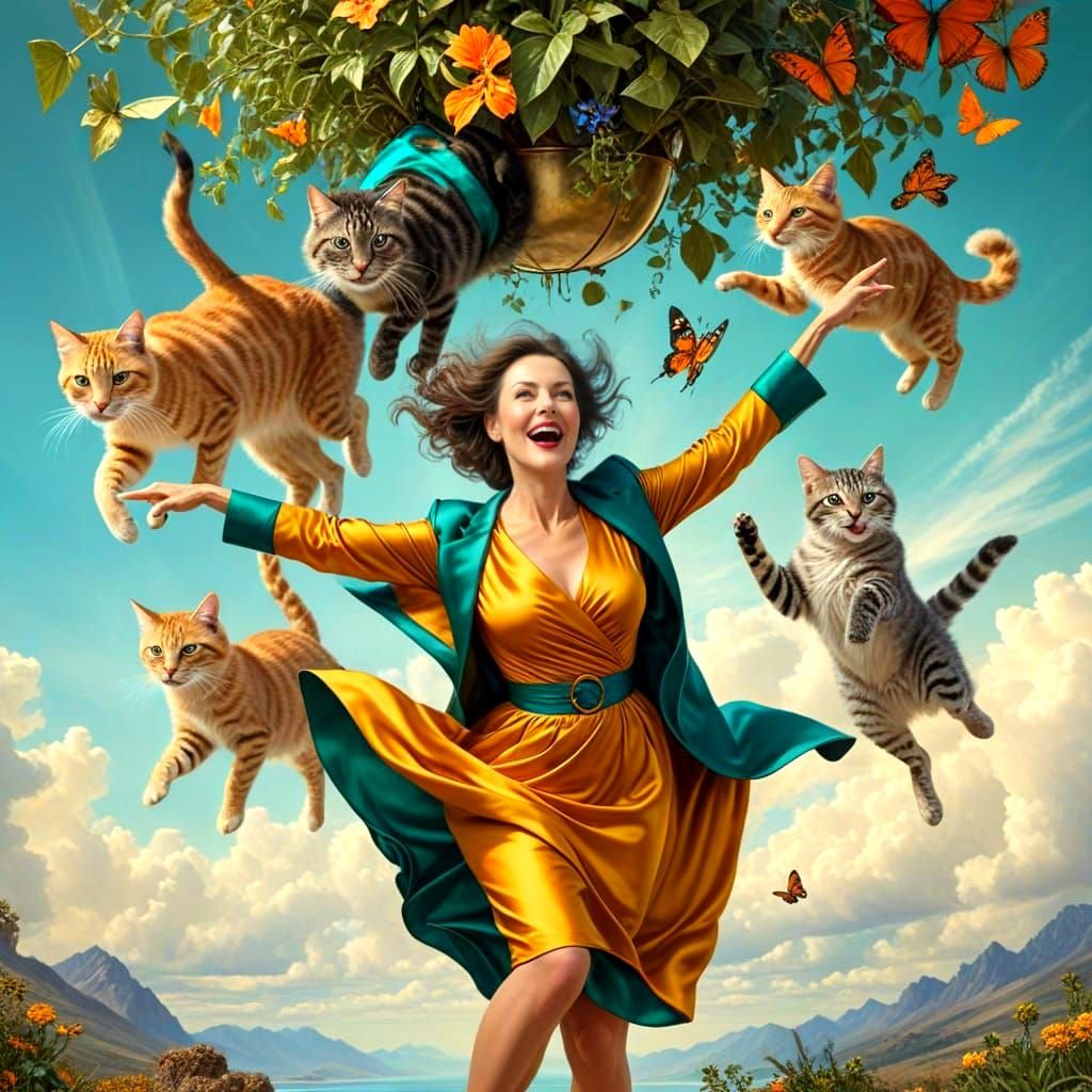 highly dynamic hyperrealistic full-height photographic portrait of happy charismatic 40-year-old lady in surreal fantastic scene actively moving, exercising, dancing, jumping, bending, twisting, reaching, balancing, climbing, turning, kicking, gesticulating, lady in active motion, energetic motion, dynamic ...