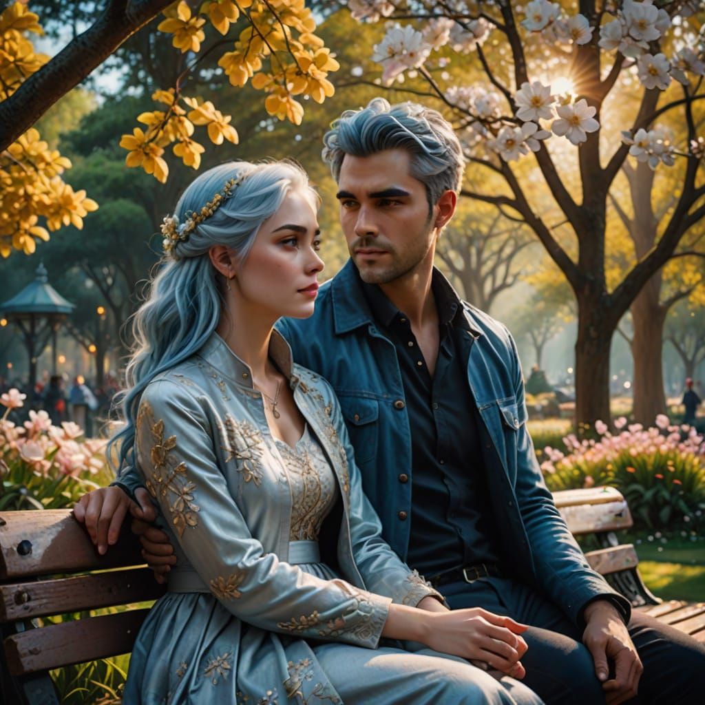 This image shows a young woman with silver-blue hair sitting on a park bench with a handsome young man. Soft mist and warm sunlight create a romantic, hyperdetailed fantasy scene with vibrant colors.