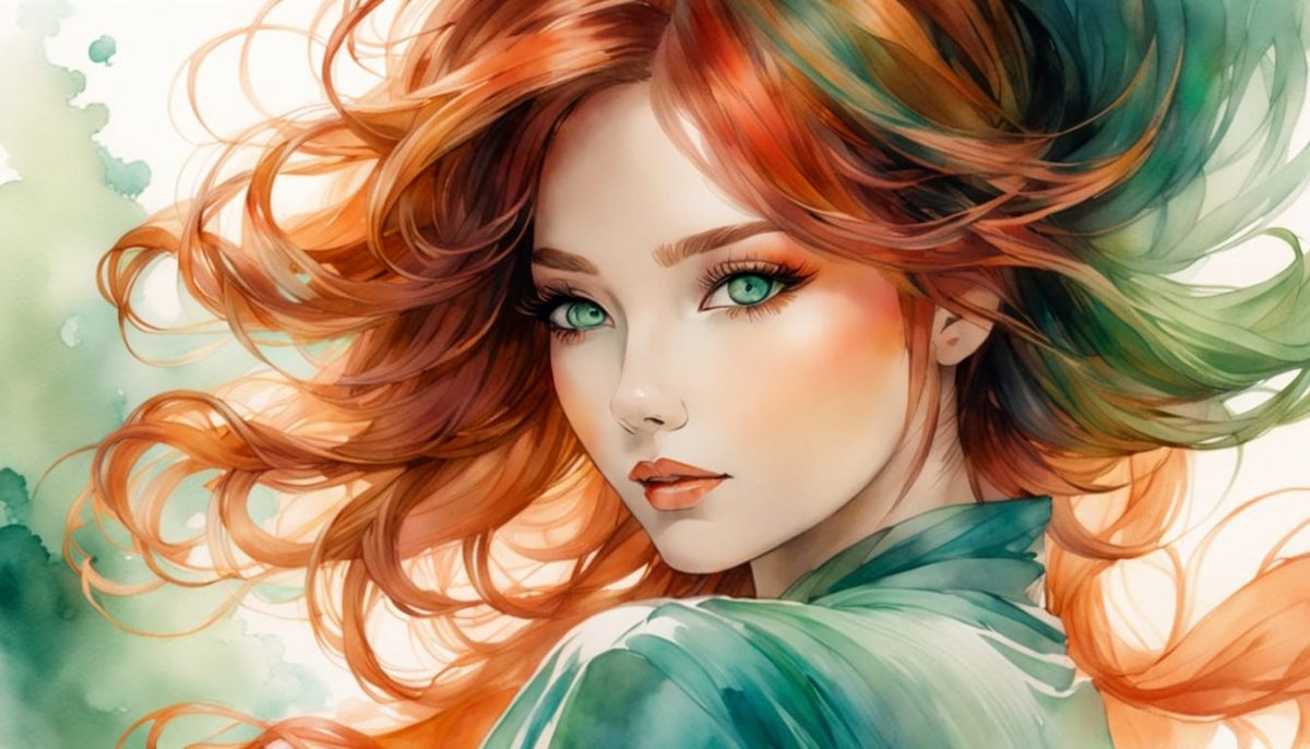 This image shows a beautiful woman with auburn hair and green eyes in a full view portrait. The sketch is rendered with Japanese ink and watercolor wash using orange and teal shades, creating a dreamy, ethereal aesthetic.