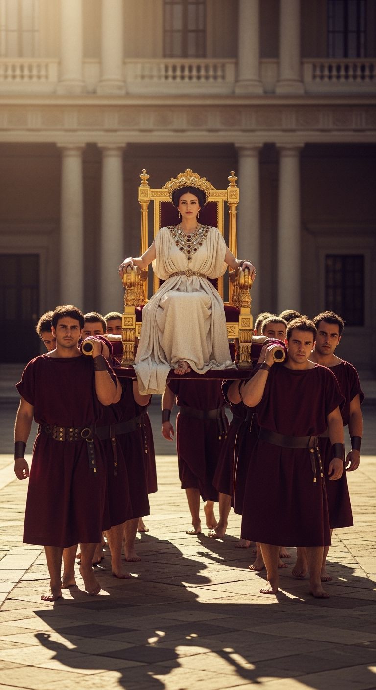 This image shows a Roman Empress with jewels, sitting on a gold throne carried by twelve servants in a sunlit courtyard. The professional photography features shallow depth of field and a bokeh effect.