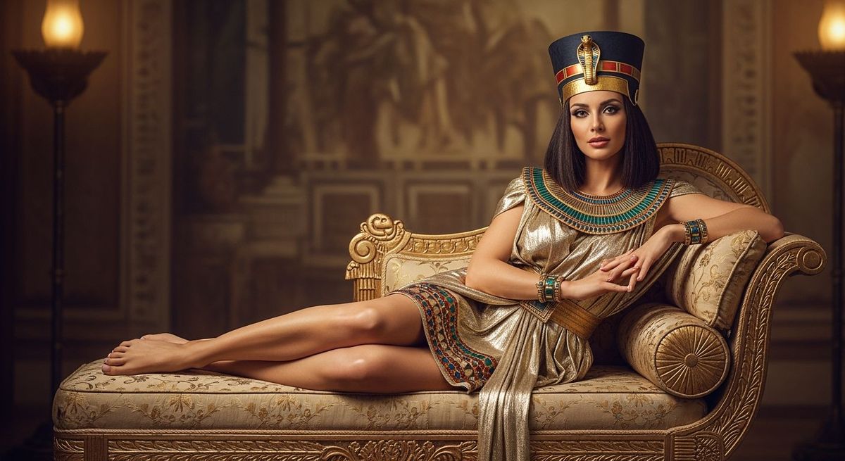 This image shows an Egyptian queen relaxing on a chaise lounge. She wears a gold and emerald toga with ornate jewelry in a lavish Egyptian setting. The image has the sharp focus of professional photography.