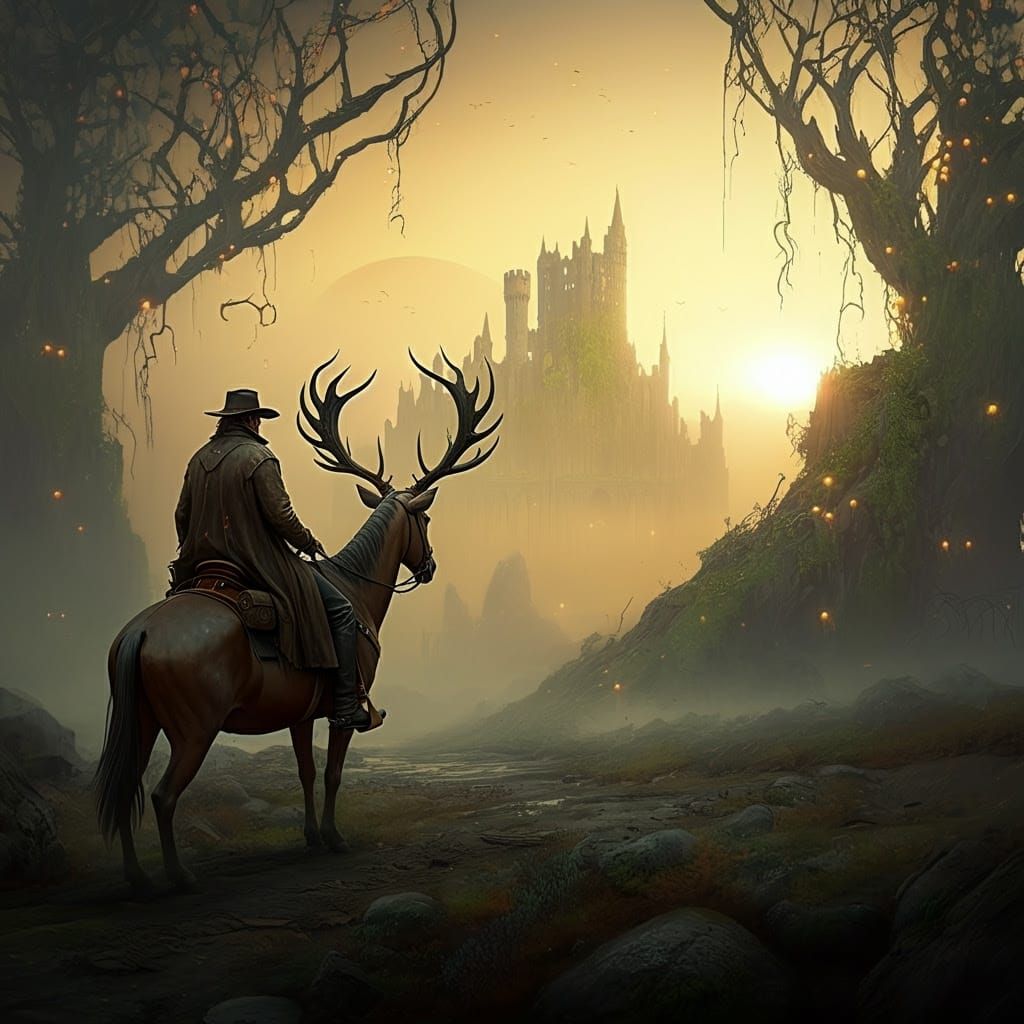 This image shows a lone cowboy on a majestic horned stag galloping through a mystical realm of twisted trees and glowing mist, with a medieval castle in the distance, under a warm orange sunset glow.