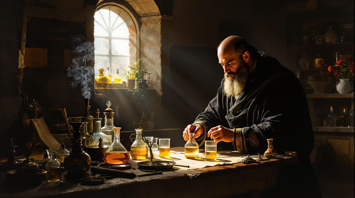 A detailed oil painting depicts Al-Kindi in his 9th-century Baghdad lab, blending medicine and perfumes. Inspired by Dutch masters, it features chiaroscuro lighting and rich, earthy tones.
