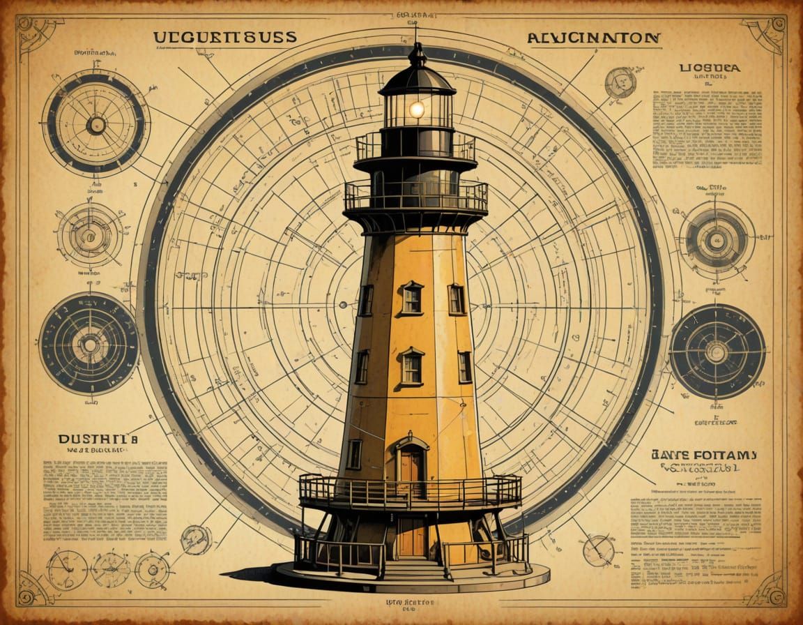 This striking image depicts a vintage lighthouse in a detailed cutaway diagram, revealing its mechanical parts in a retro-futuristic aesthetic with geometric labels and a weathered paper texture.
