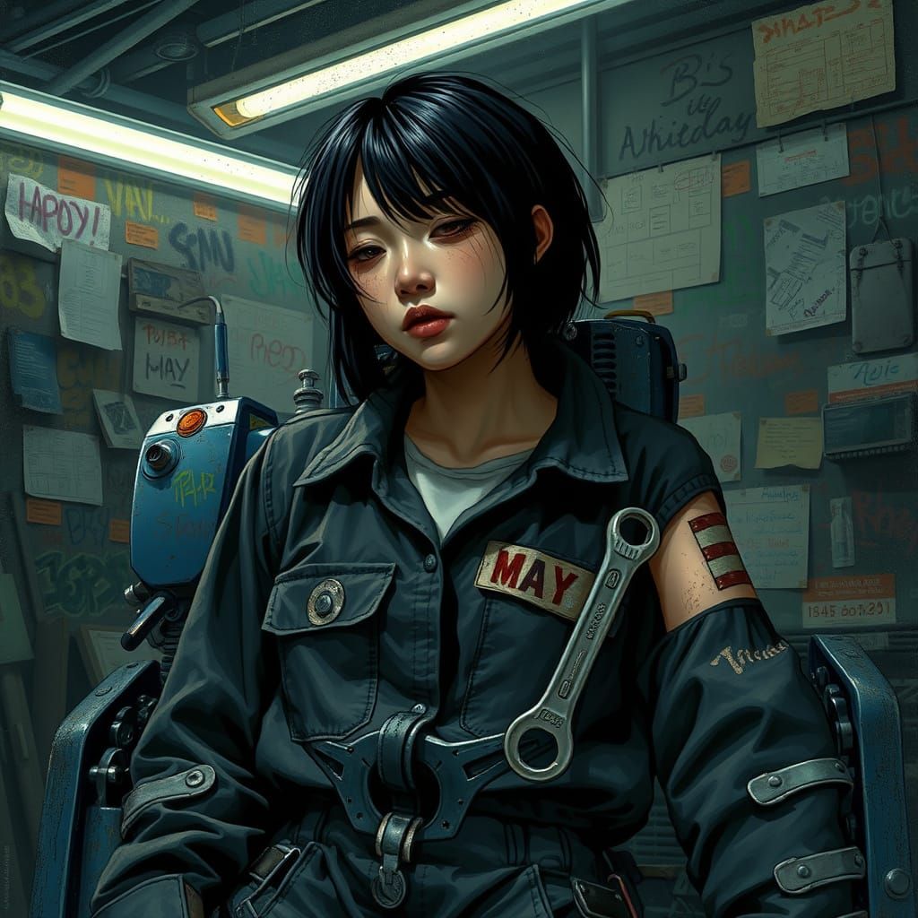 Hypermaximalist urban punk collage with graffiti strokes: A weary Asian mechanic slumps against her dark blue-plated robot, her wrench hanging limply from oil-stained fingers. Her choppy black hair falls across haunted eyes, tears cutting clean tracks through the grime on her cheeks. Her threadbare jumpsuit hangs loose on her frame, the empty sleeve of her missing arm pinned up. Workshop walls loom with failed blueprints and abandoned projects, shadows consuming her last functioning companion.