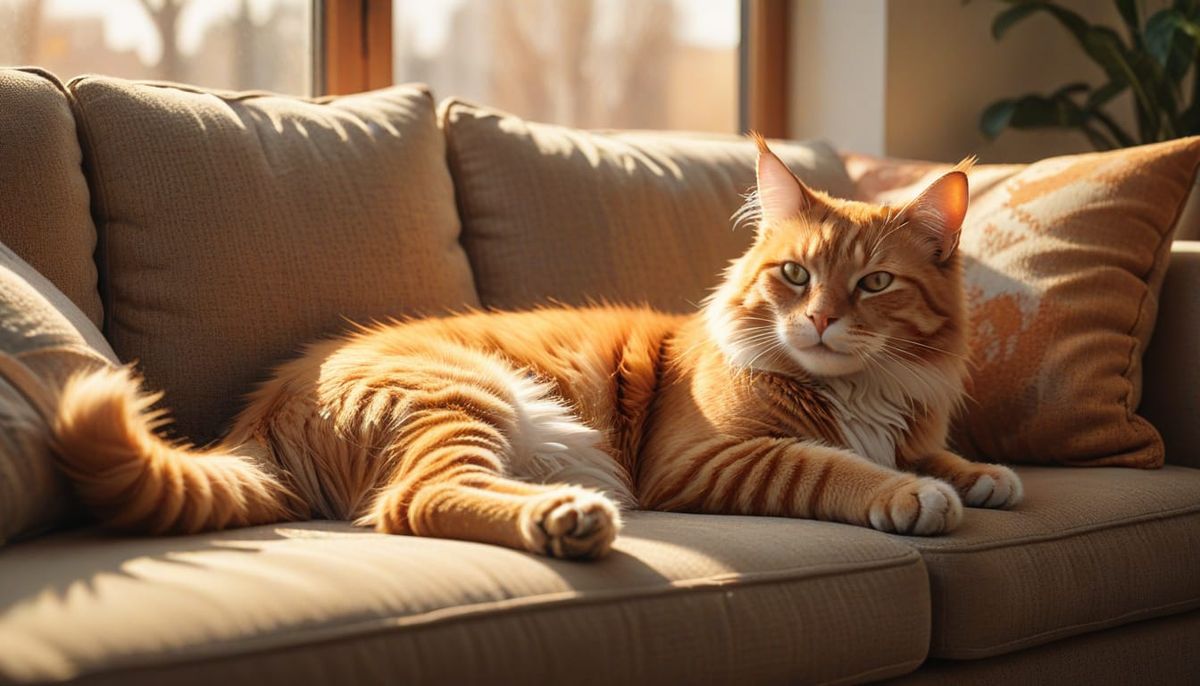 This image shows an orange tabby cat relaxing on a couch in a sunlit room. The digital illustration uses soft brushstrokes and warm colors to create a cozy and peaceful atmosphere.