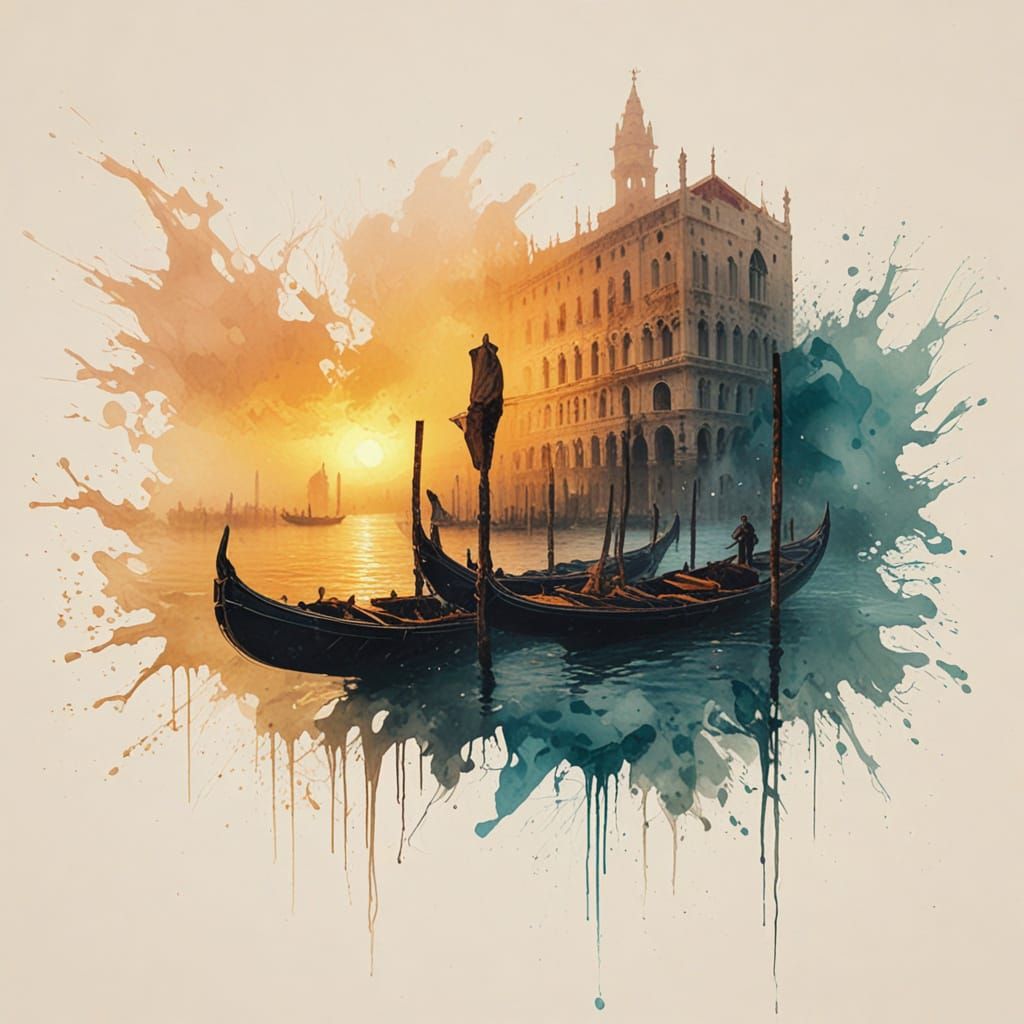 A stunning image of Venice's Grand Canal during a storm. The scene features gondolas on the waterway, historic palazzos, and dramatic storm clouds in an ethereal, vibrant golden hour, in a soft color wash style.
