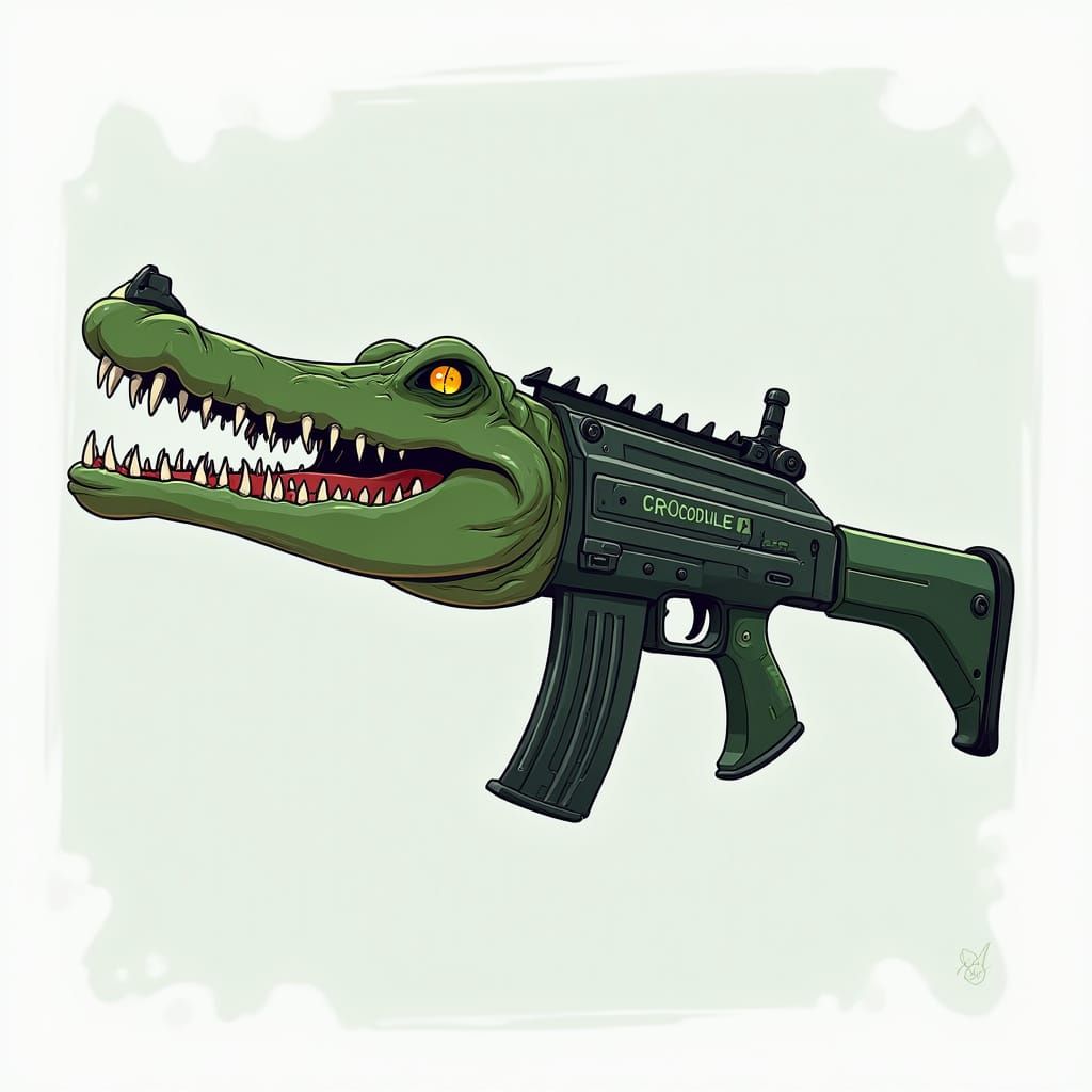 A cartoonish, dark green assault rifle shaped like a crocodile's head with 'CROCODILEZ' on the side. This image blends futuristic designs with sleek lines and vibrant colors, isolated on a transparent background.