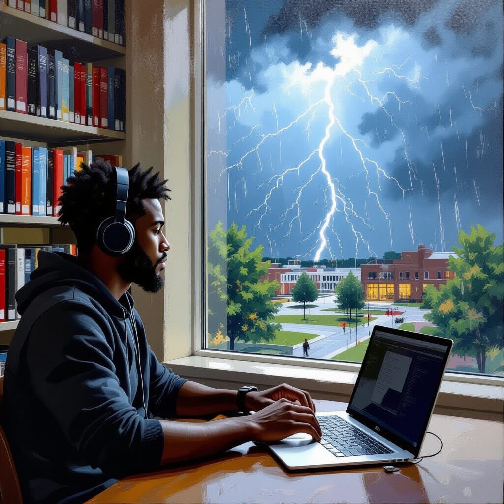 In the real world, the windows next to the man are reflecting the library lights overhead. But at least HiDream I1 didn't put shelves of library books out in the rain, unlike some models (I'm looking at you, Flux Schnell and Juggernaut Flux Lightning...).