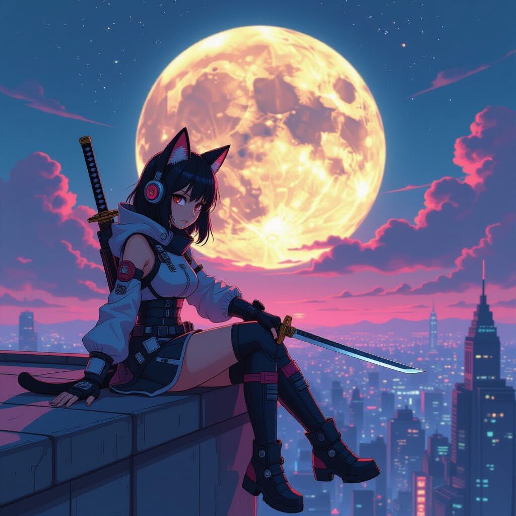 This image shows a cyberpunk anime girl with cat ears sitting on a rooftop with a sword. The scene is lit by neon lights and a massive moon, in a cel-shaded aesthetic.