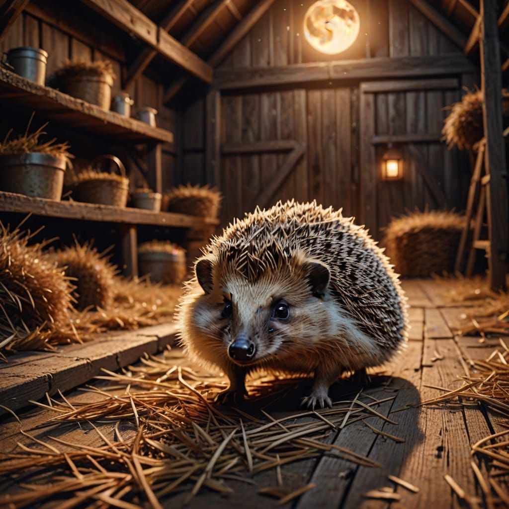 A charming digital artwork of a hedgehog exploring a vintage barn attic. The watercolor style and golden hour lighting create a cozy, serene atmosphere with warm colors and rustic charm.