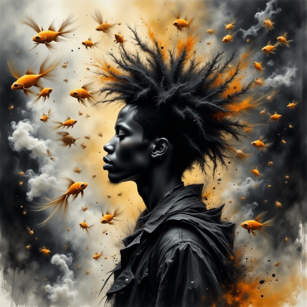 A low-angle view of an afro-mohawk punk silhouette seen in profile, surrounded by numerous small vibrant orange clown-fish with elegant tails drifting and flying through the air. The atmosphere is wet, dense, and smoky, with swirling vapor, heavy haze, and ethereal wisps of smoke that blend into the ...