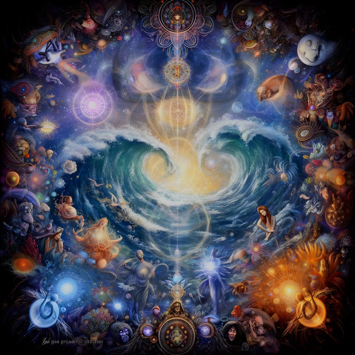 This image depicts majestic, bubbling waters symbolizing the sea of souls and infinite possibilities. It captures vibrant diversity and genius in transition zones, with light and matter in dynamic balance.