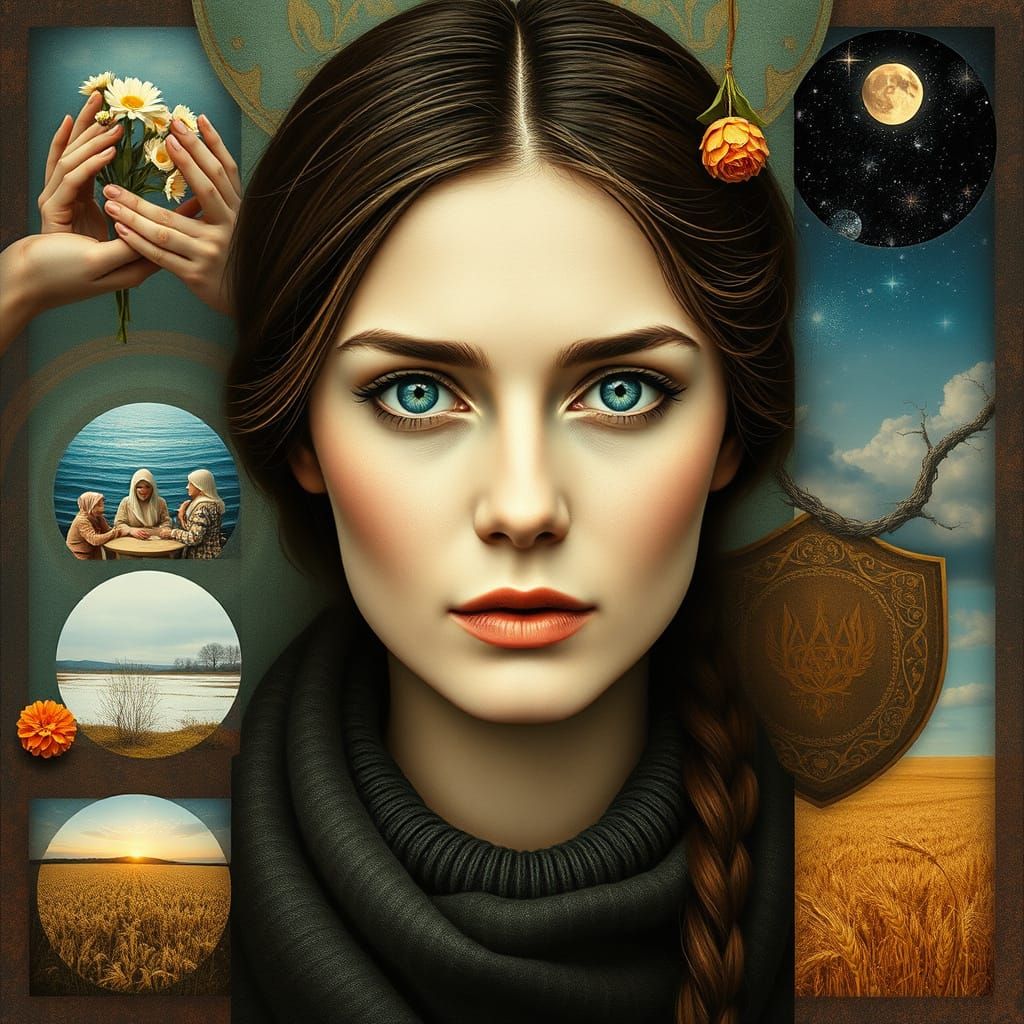 This image is a symbolic representation of the divine feminine in Ukrainian mythology, featuring a serene woman's face at its center, surrounded by smaller images of mythological archetypes and natural elements, blending earthy tones, pastel colors, and subtle accents, evoking a mystical atmosphere remin...