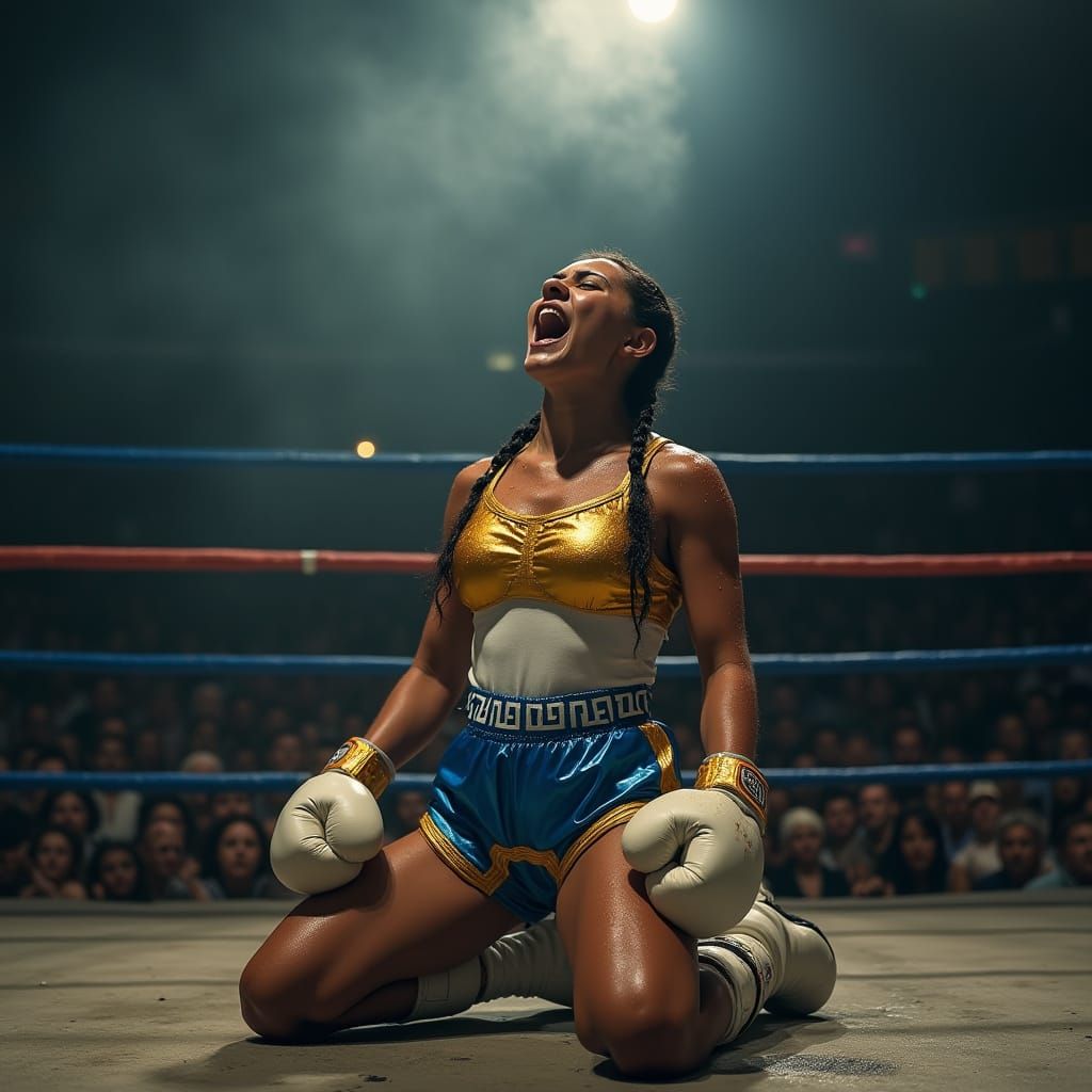 A dramatic image of a female boxer in a Greek-themed outfit kneeling in a boxing ring after winning a match. The image features dramatic lighting, sweat details, and a smoky background, rendered with cinematic realism.