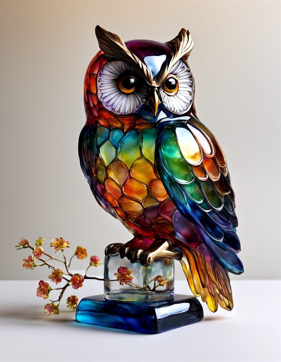 A beautiful, highly realistic glass statue of an owl, detailed with alcohol ink, stained glass effects, and delicate golden line art, adorned with colorful small flowers.