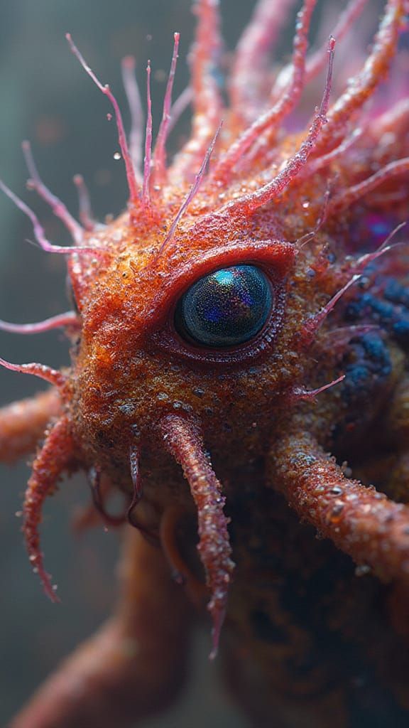 A striking picture of a bizarre monster in a vibrant nebula. It features iridescent feathers and tentacles, with a pop art flair and hyperdetailed maximalism in a surreal, J-horror aesthetic.