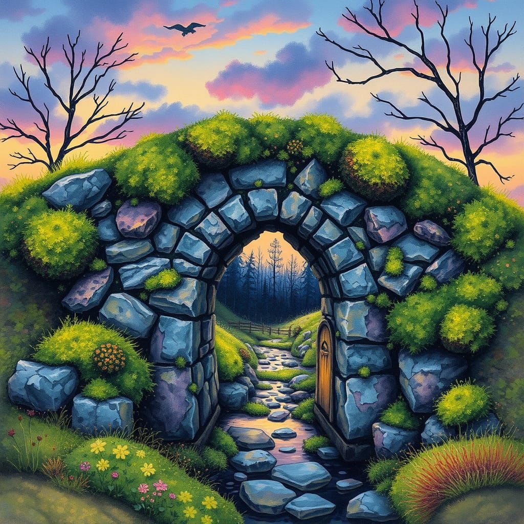 A vibrant stone bridge at twilight, covered in moss and featuring a hidden fairy door. This highly detailed image is rendered with watercolor and spray paint textures in a whimsical art style.