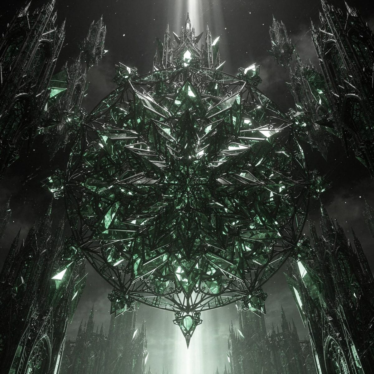 This abstract image features intricate geometric patterns with a metalcore gothic aesthetic, rendered in shimmering emerald glass with surreal reflections. Expressing determination.