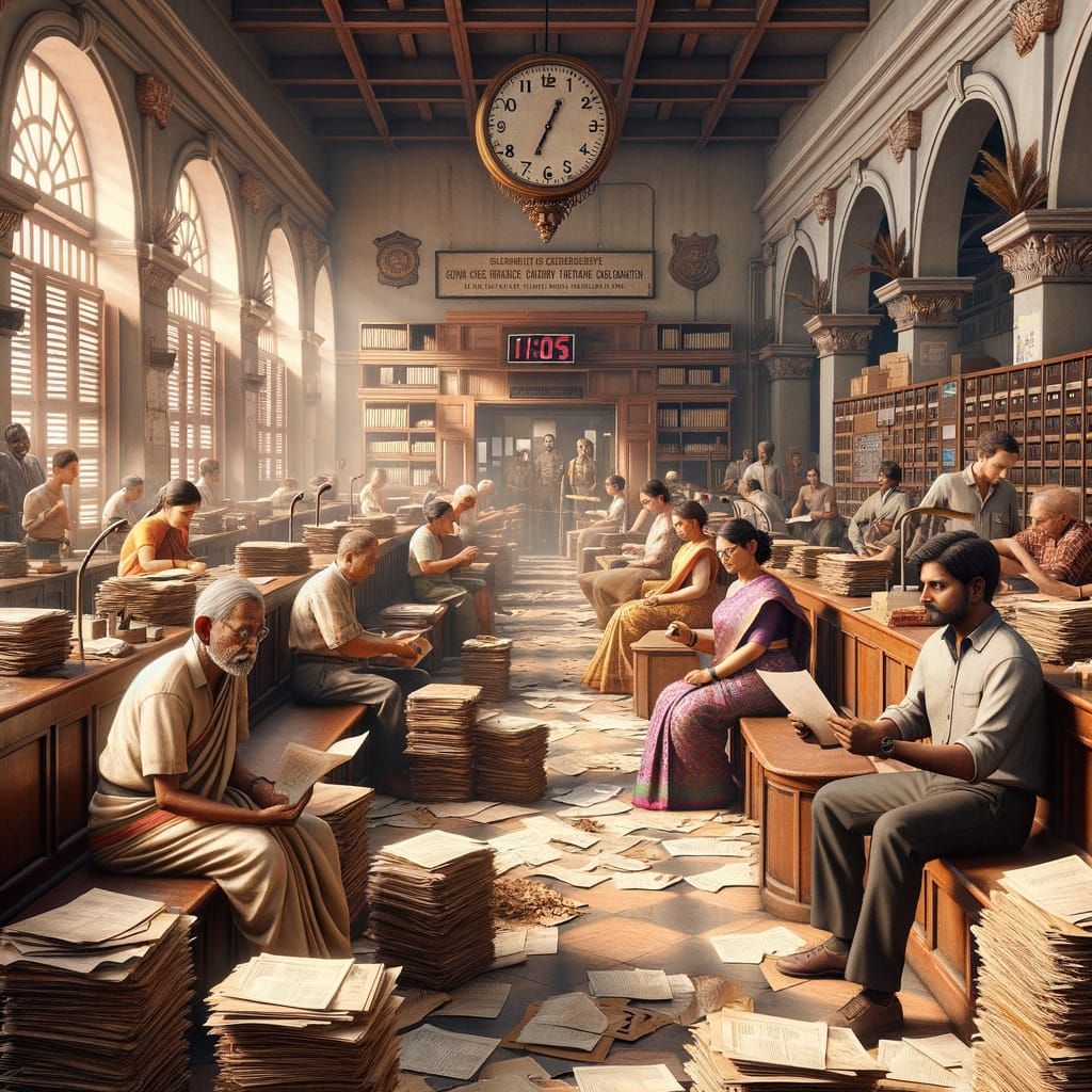 This image shows the interior of an old government office in South India, featuring citizens waiting for service. The scene is captured with warm lighting and intricate details, reminiscent of traditional oil paintings.