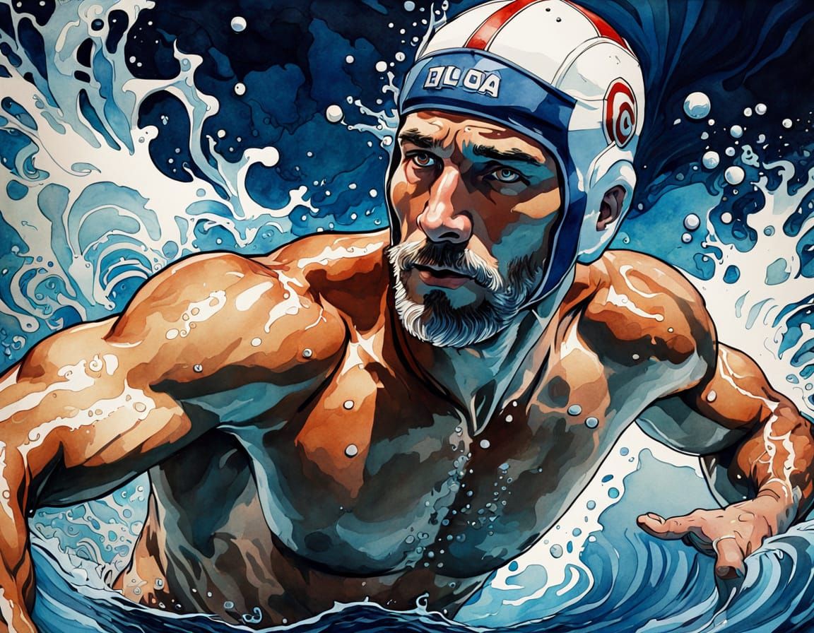 A vibrant watercolor painting in an Art Nouveau style of a man playing water polo. The image captures dynamic splashes, intricate details, and bright lighting in a masterpiece of realism.