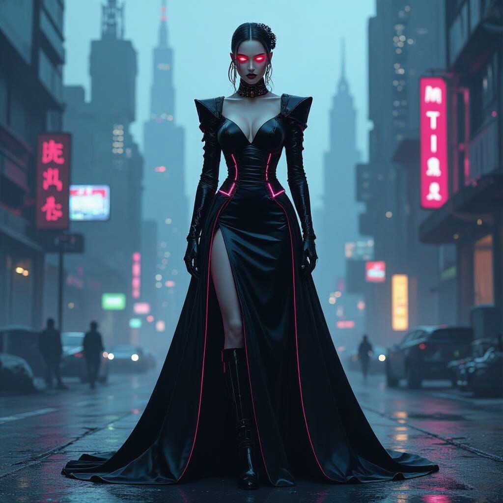 This image shows a futuristic reimagining of Frankenstein's bride in a cyberpunk aesthetic. The figure is clad in a sleek black gown with neon accents, set against a dark, industrial cityscape.