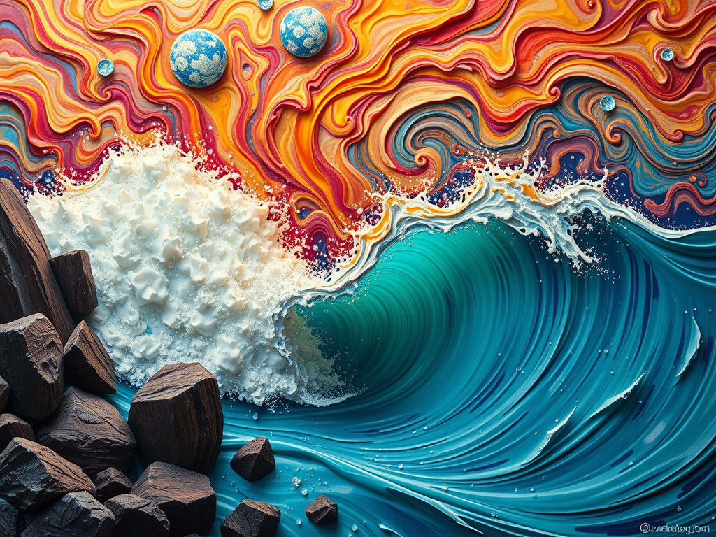 A 3D rendered vision of a surreal, ultraminimal Dreamland scene. The art evokes Van Gogh's style with fire opal colors in a lowbrow aesthetic.