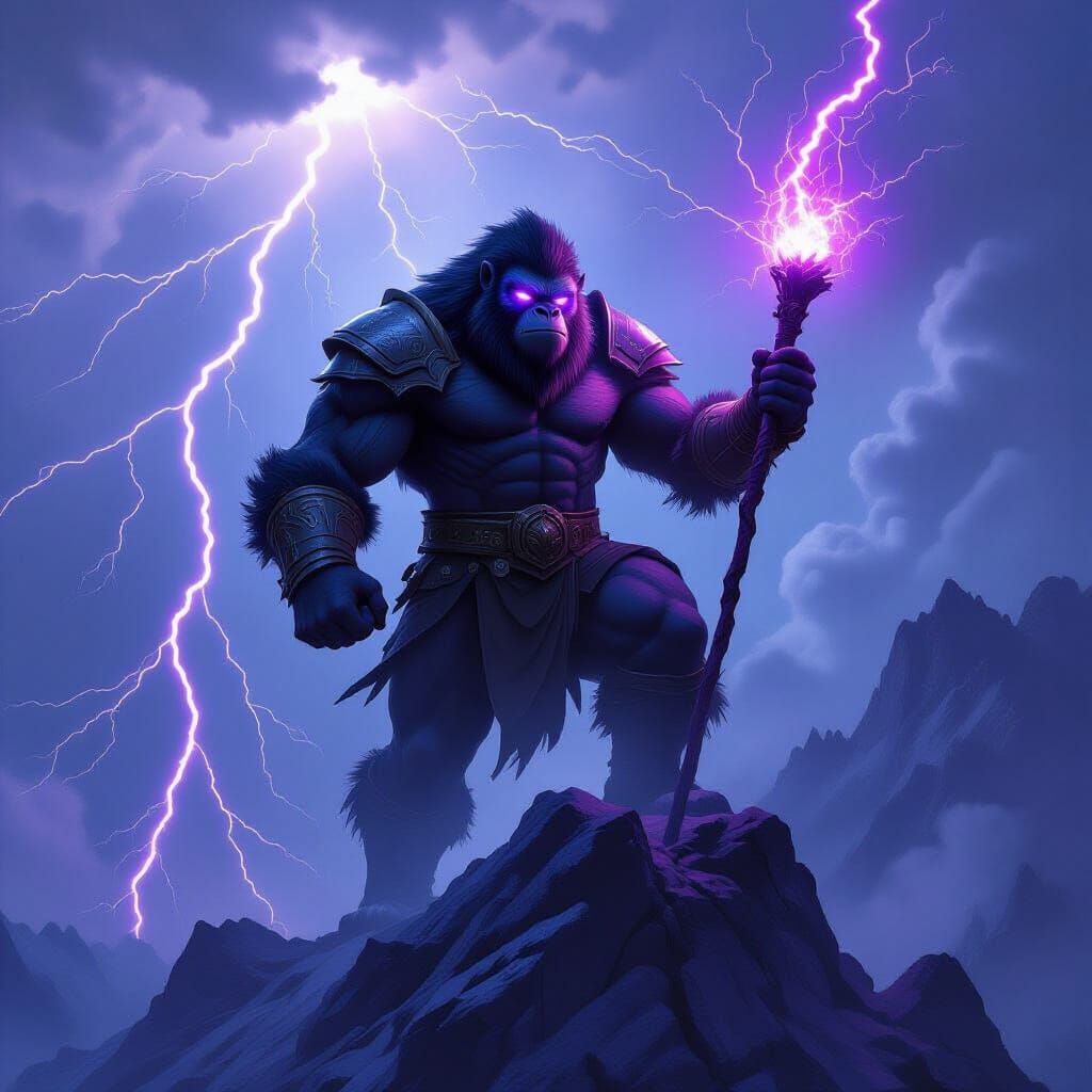 This dark fantasy concept art features an enormous armored ape holding a glowing staff on a mountain peak amidst a violent lightning storm, rendered with dramatic lighting and atmospheric effects.