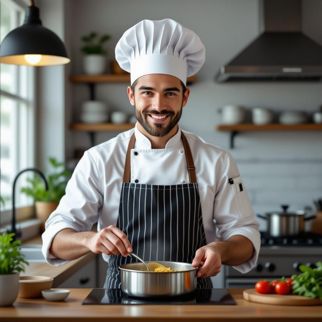 This image shows a young chef in a modern kitchen preparing food. The art style blends digital painting with hyper-realism, reminiscent of science fiction art.