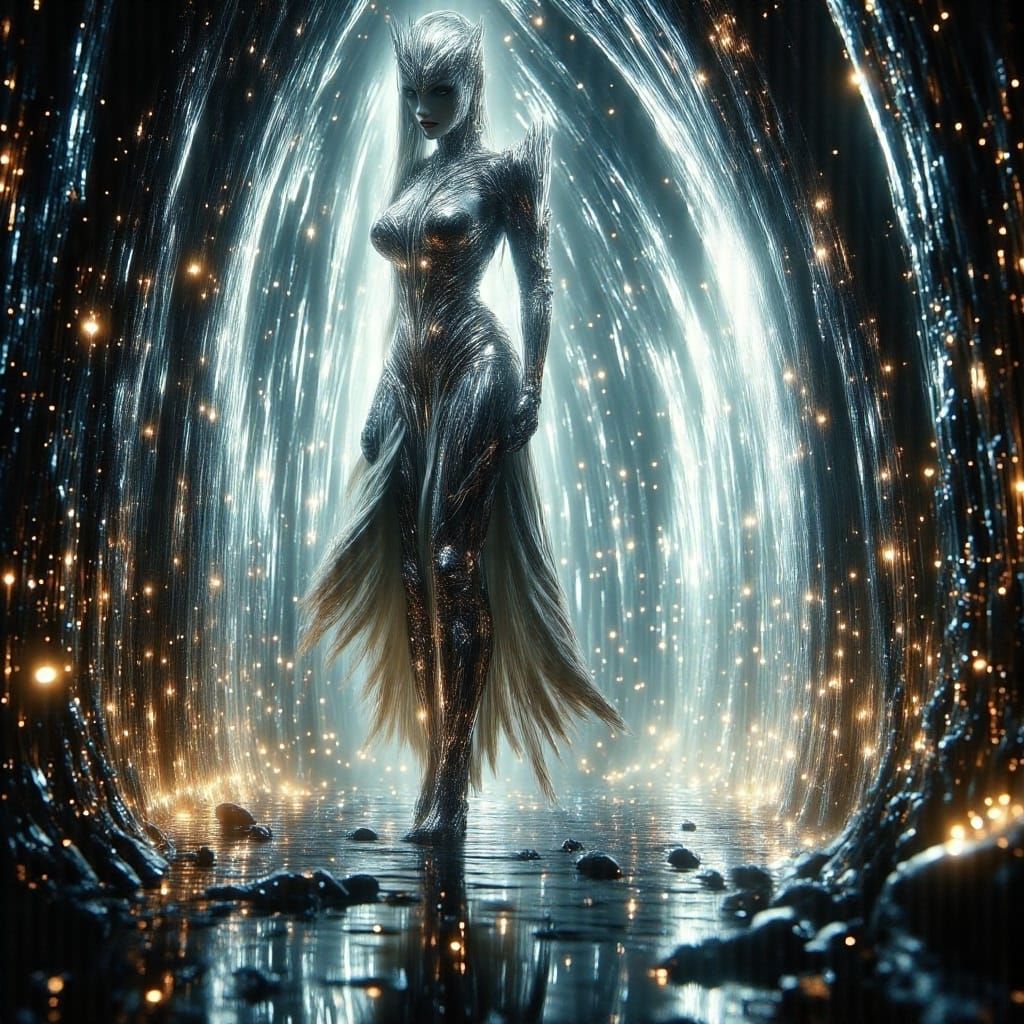 A woman in a silver dress stands by a glowing portal in a futuristic neon city. This artwork blends dark, mystical, and cyberpunk aesthetics with a painterly feel.