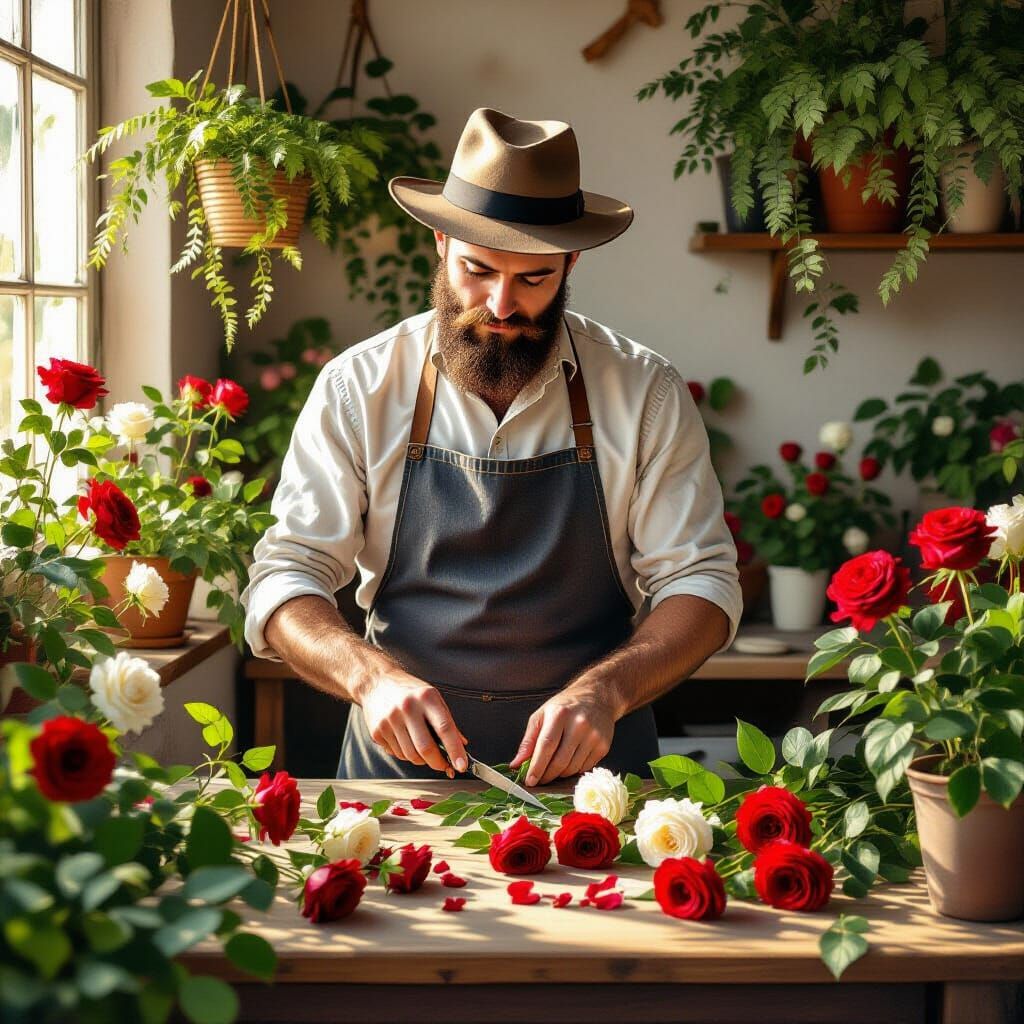 This image shows a florist in his workshop, surrounded by greenery, cutting roses. The sunlight gives a soft, warm glow in a vibrant, surreal style with expressive brushstrokes.