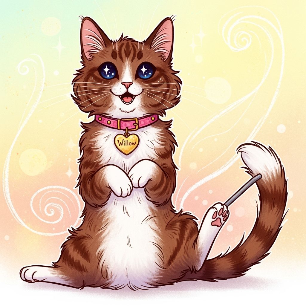A charming image of a fluffy brown cat with striking blue eyes, sitting upright. The artwork is rendered in a warm, whimsical style, showing a cute collar and relaxed back legs.