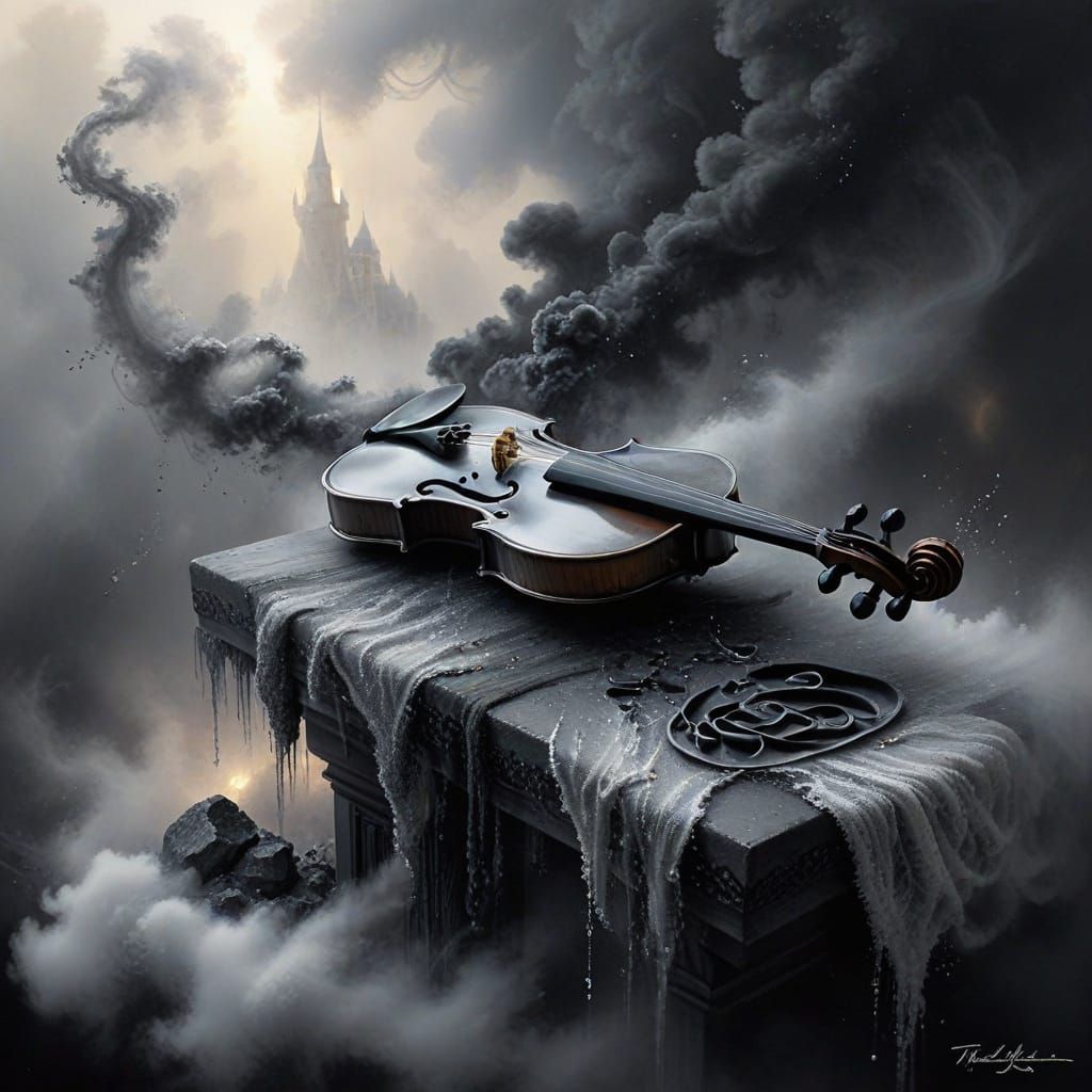 This hyperdetailed charcoal drawing depicts ink shaping a violin with black smoke and velvet silk strands. The ethereal fantasy style creates a mist-like atmosphere.