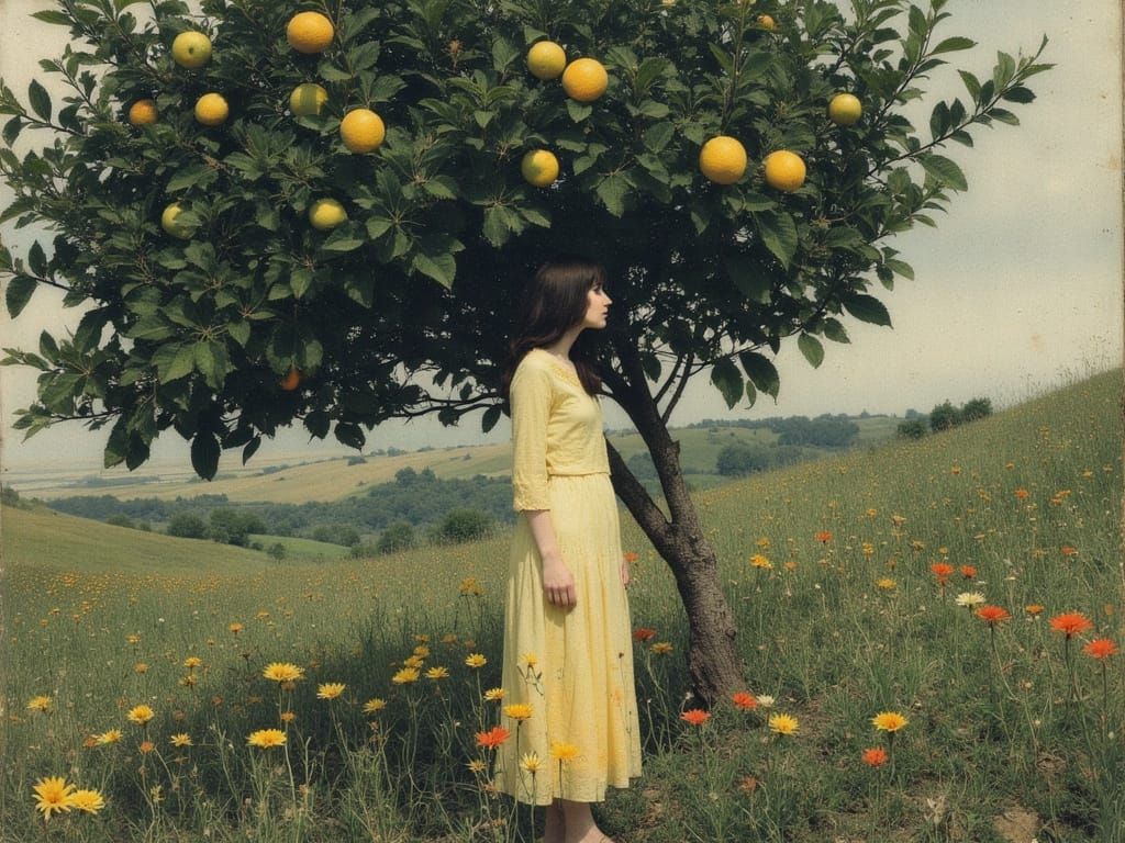 This serene image depicts a woman standing beneath a vibrant lemon tree, surrounded by wildflowers, evoking memories of days past in a soft, dreamy watercolor style reminiscent of Andrew Wyeth's everyday scenes, with delicate brushstrokes and muted tones.
