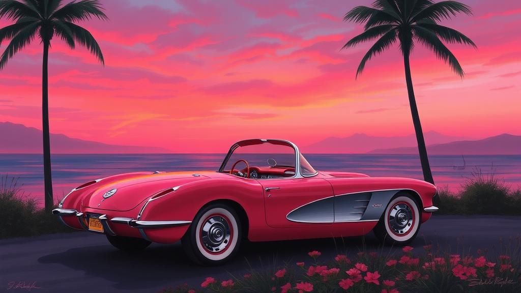 A vibrant pink Corvette is depicted against a colorful, painterly sky. The image evokes a Thomas Kinkade-inspired aesthetic with a nod to the 1980s.