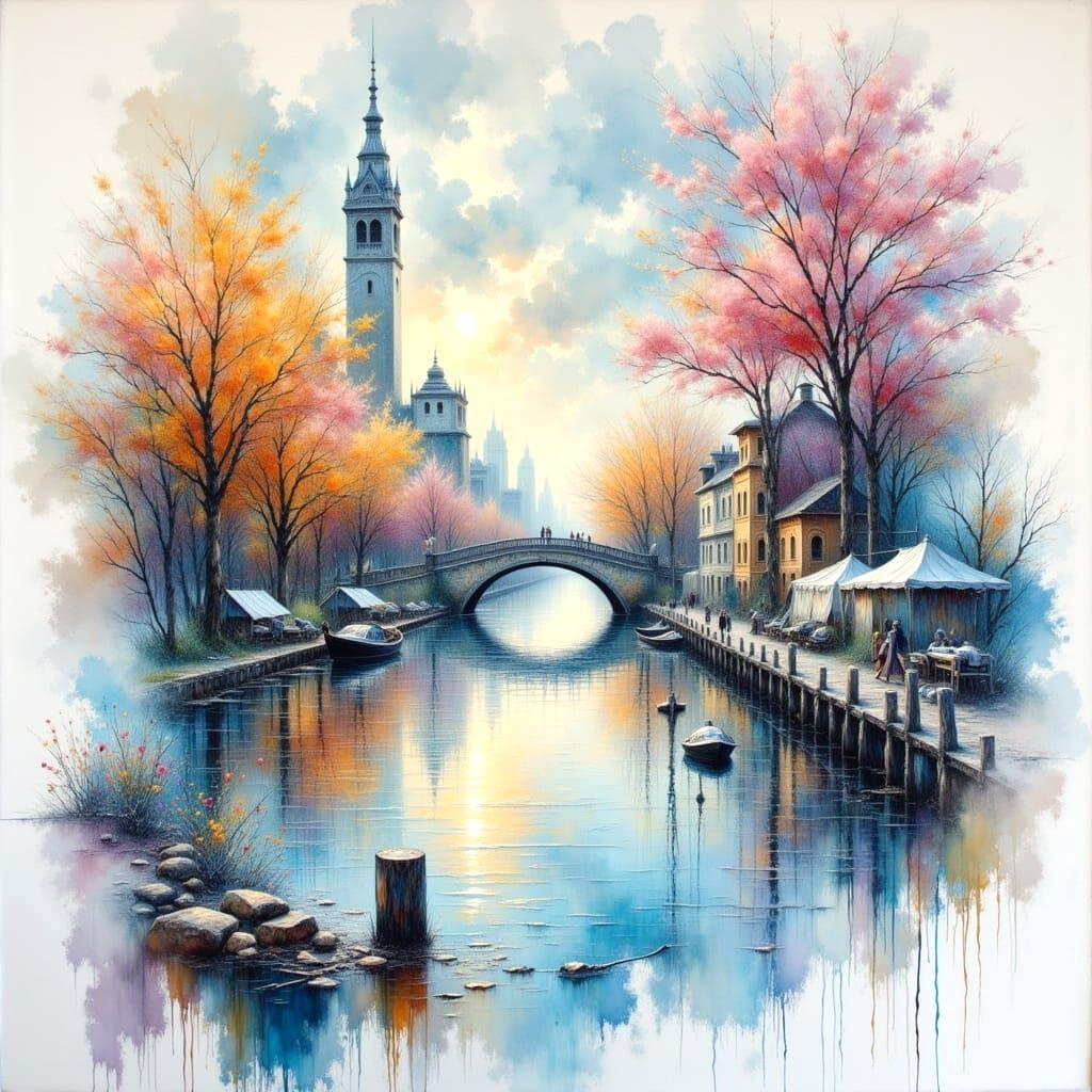 This image shows an abstract riverside scene with fluid, transparent, colored water. The alcohol ink art features white splashes, creating an ethereal, dreamlike effect in an impressionistic style.