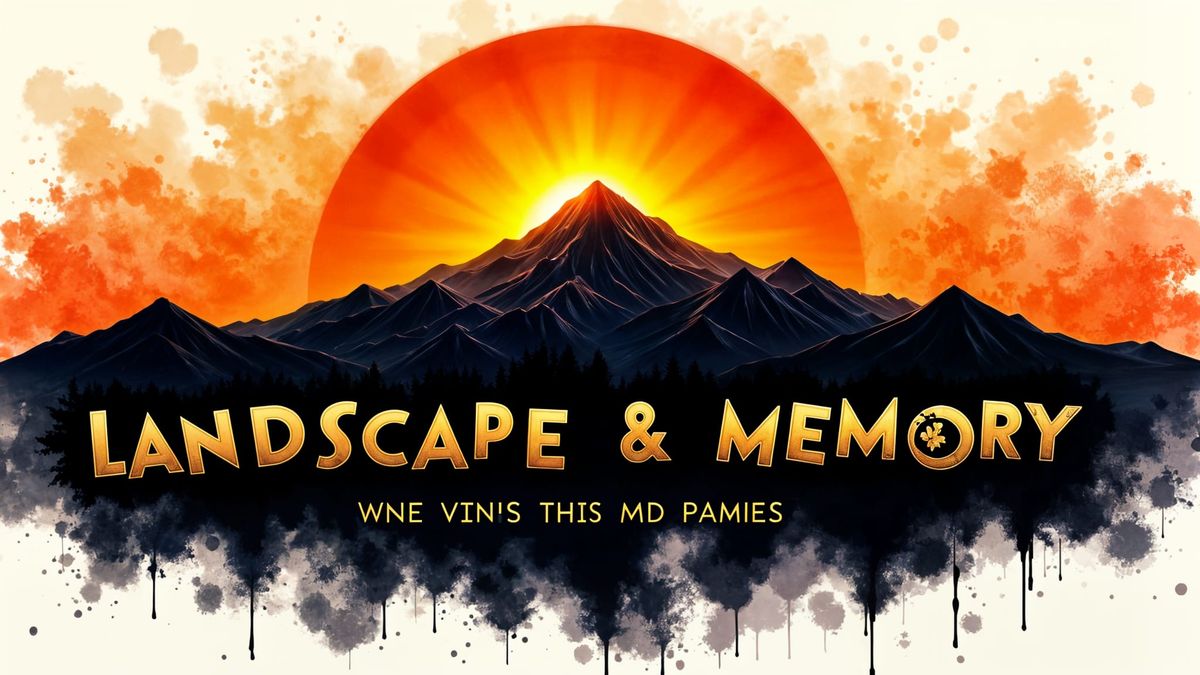 This image shows the words 'LANDSCAPE & MEMORY' in a striking, silhouetted font against a backdrop of black paint. The letters are backlit, creating a dramatic visual effect.