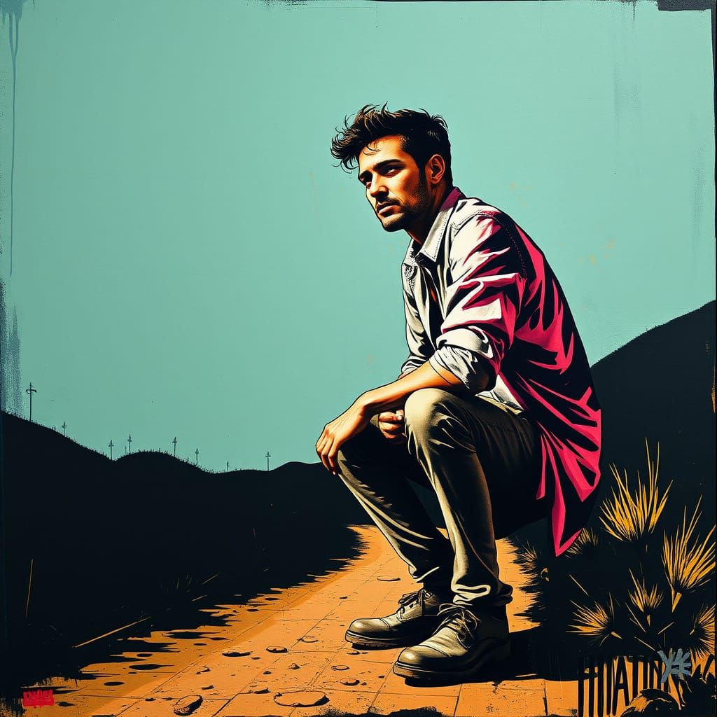 A figure sits pensively by the roadside in urban street art style. The artwork blends stencil art with elements of raw expressionism and emotional depth reminiscent of a self-portrait.
