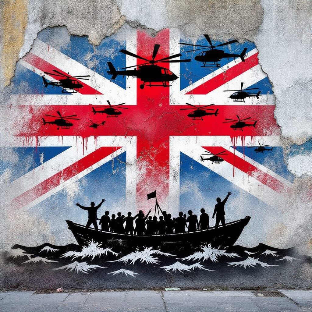 This image features gritty stencil graffiti art depicting a migrant boat against a backdrop of a faded Union Jack flag and hovering drones, conveying themes of surveillance and exclusion.