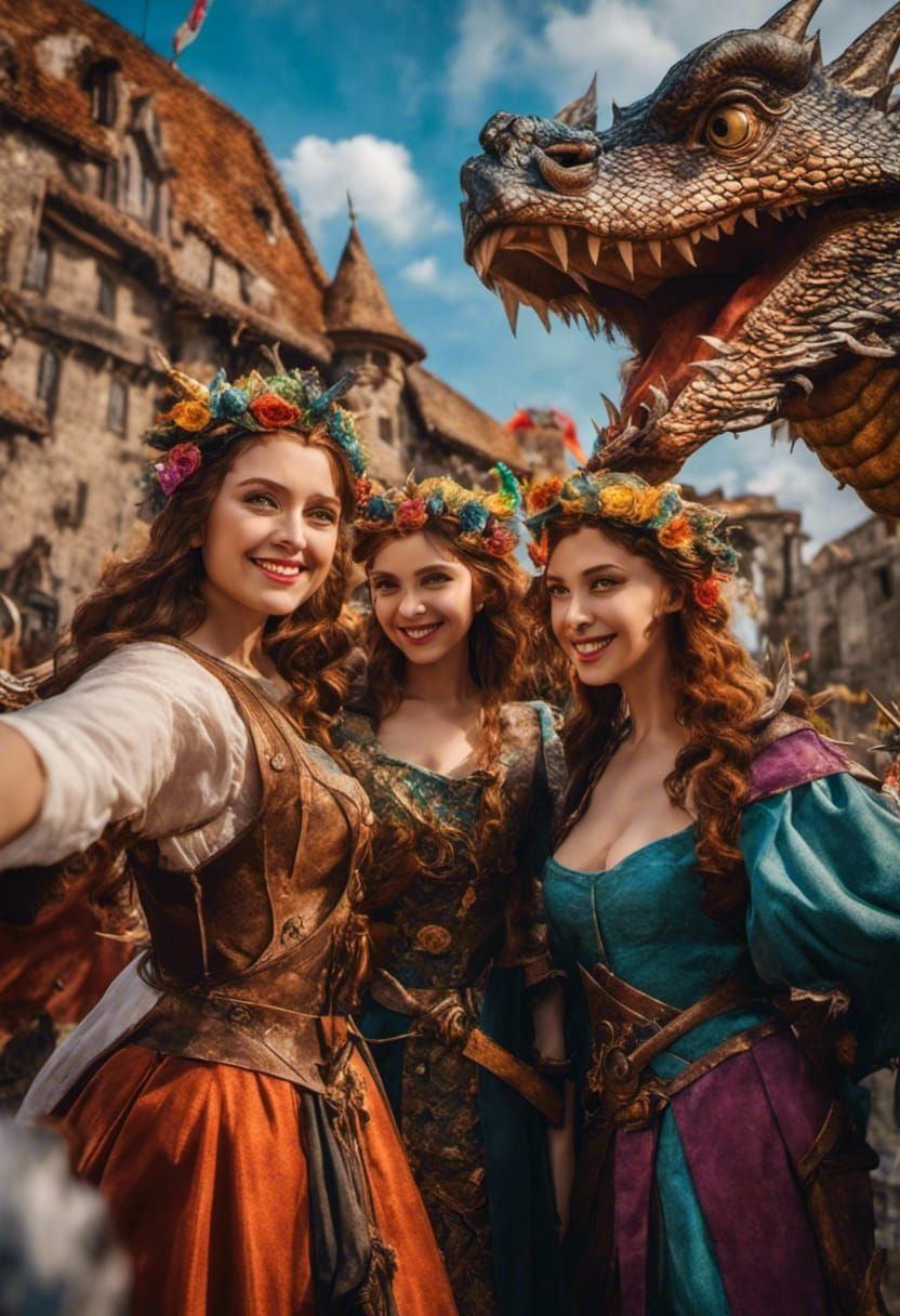This image shows a group selfie with medieval maidens and brightly colored dragons. The high-resolution image captures a happy party atmosphere with intricate details and a cinematic feel.